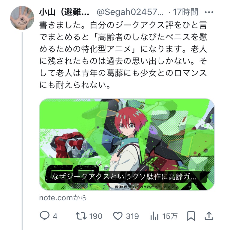 こいつってジークアクスオタに通報されて凍結したんじゃなかったの?