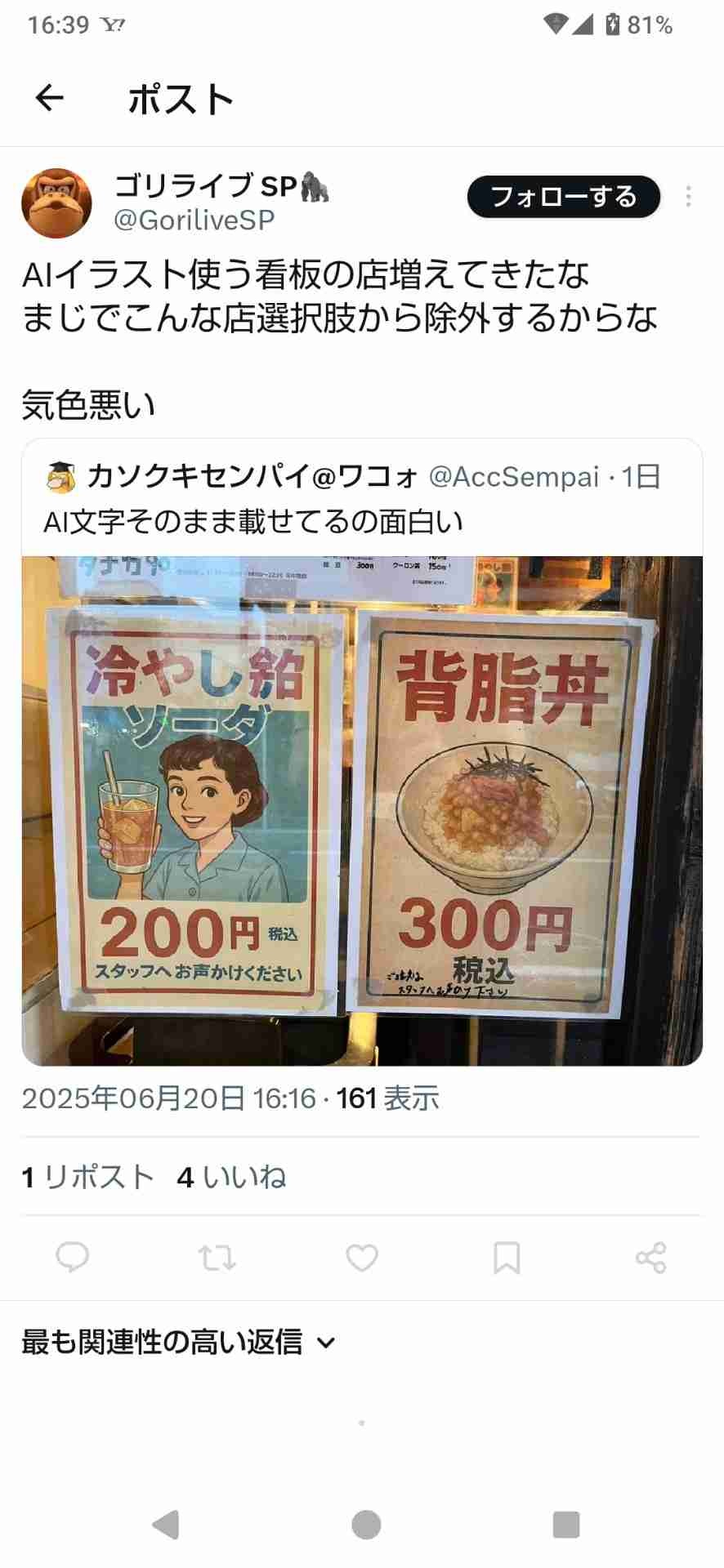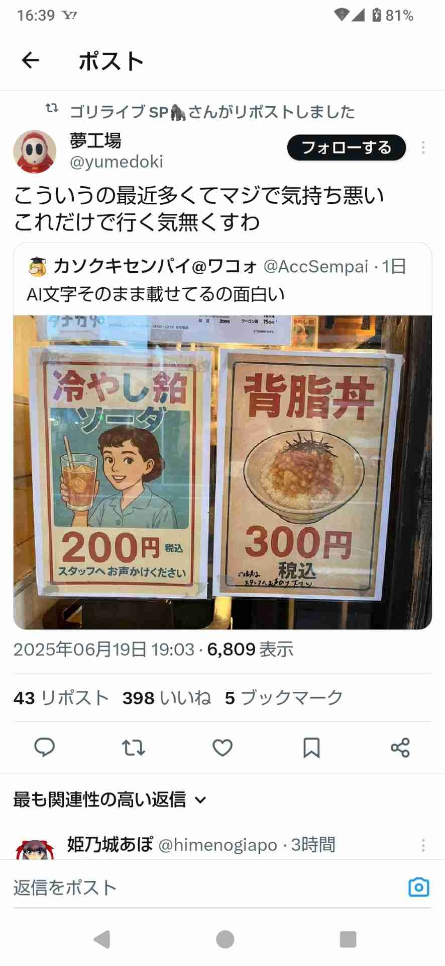 メニュー表もAIに作らせてて文字がおかしくなってる場合でもお前ら平気なの?