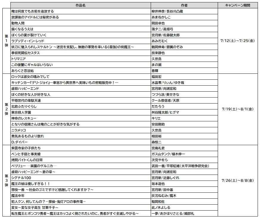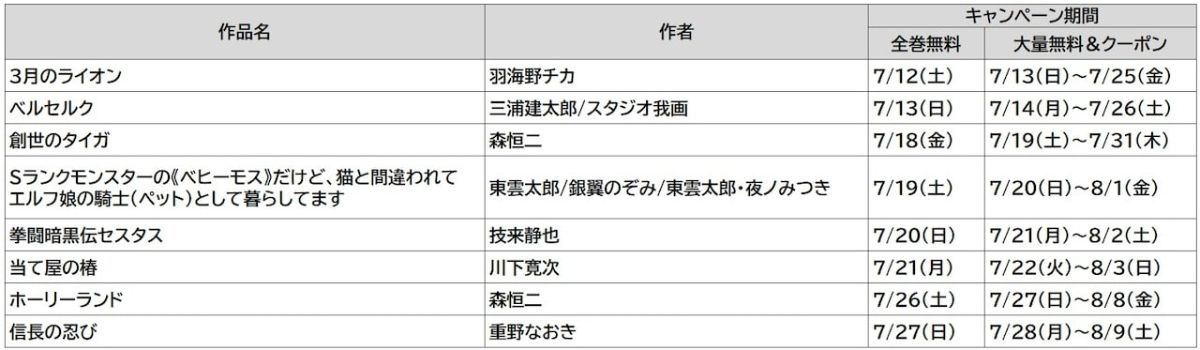 7月12日から27日までのうち計8日間に、1日1作品を24時間限定で全巻無料公開。対象作品には羽海野チカ「3月のライオン」、三浦建太郎「ベルセルク」、森恒二「創世のタイガ」「ホーリーランド」、銀翼のぞみ原作による東雲太郎「Sランクモンスターの《ベヒーモス》だけど、猫と間違われてエルフ娘の騎士(ペット)として暮らしてます」、技来静也「拳闘暗黒伝セスタス」、川下寛次「当て屋の椿」、重野なおき「信長の忍び」がラインナップされた。24時間の無料公開終了後も、翌日から13日間は無料範囲を増大。対象作品に使える冊数限定30%オフクーポンもプレゼントされる。