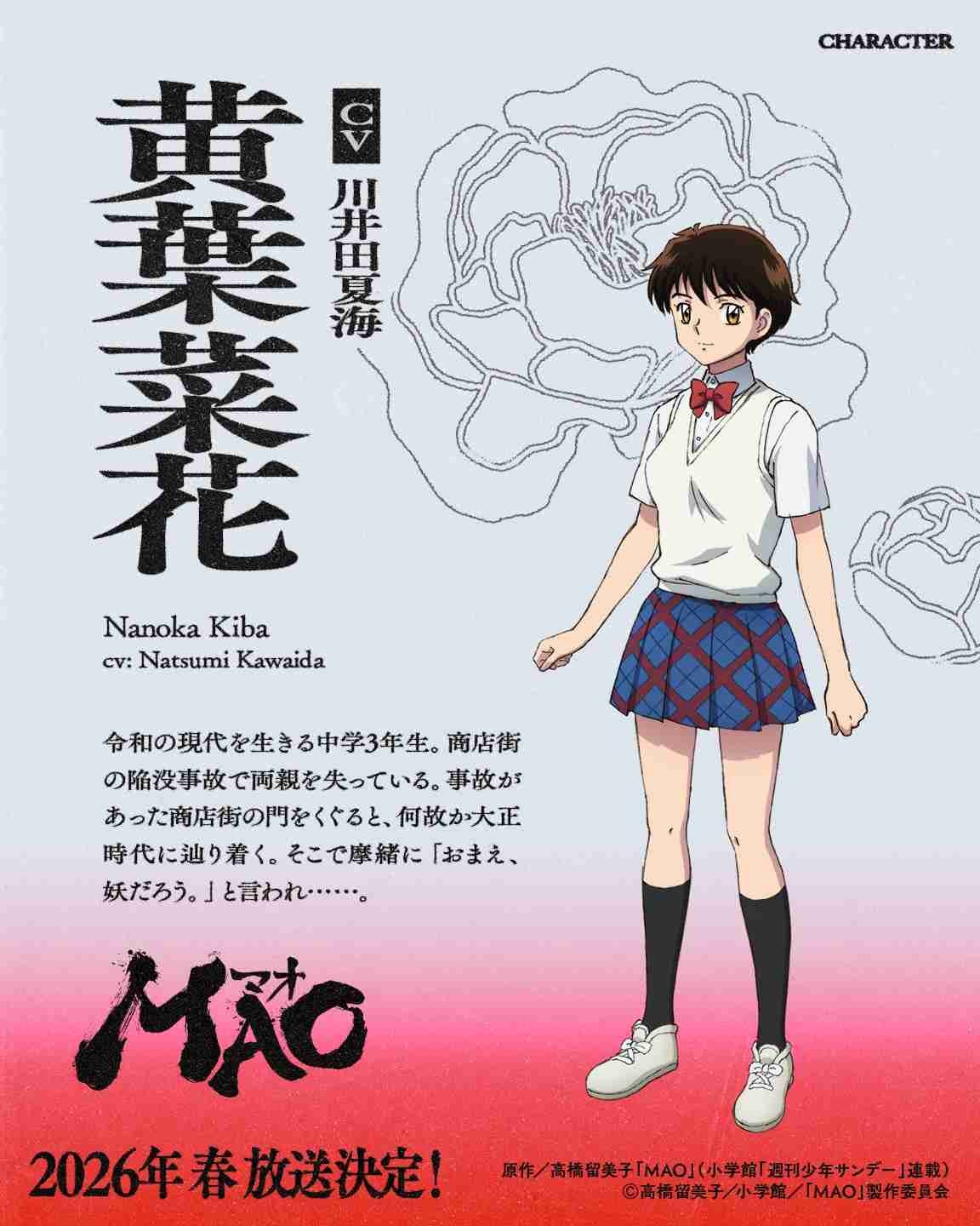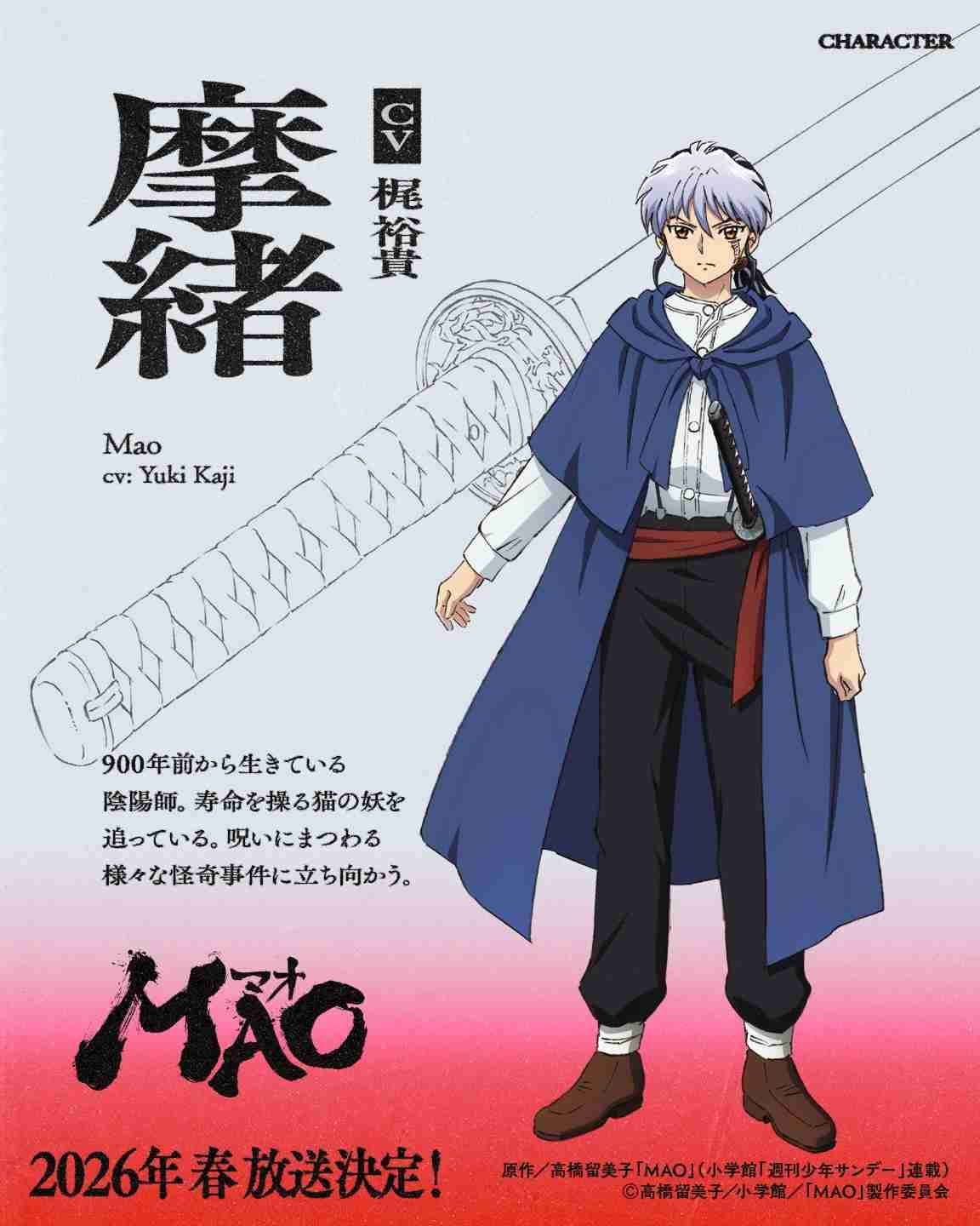 高橋留美子「MAO」がTVアニメ化され、2026年春にNHK総合で放送されることが決定。ティザービジュアルとティザーPV、メインスタッフやキャストが一挙に発表された。
