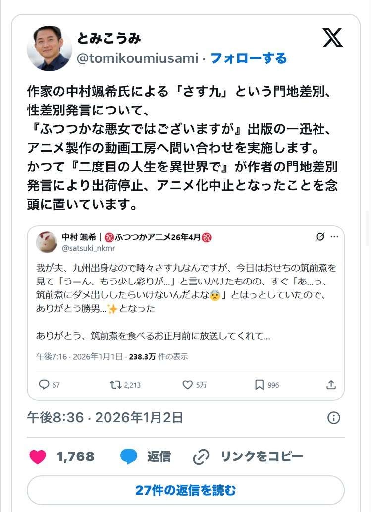 ラノベ作家 中村颯希氏の「さす九」発言が波紋 かつて『二度目の人生を異世界で』が作者の門地差別発言によりアニメ化中止