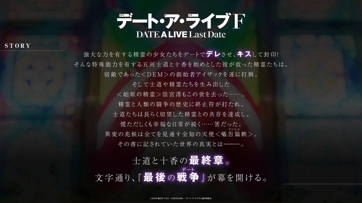 富士見ファンタジア文庫(KADOKAWA)の人気ライトノベルが原作のアニメ「デート・ア・ライブ」シリーズの完全新作アニメ「デート・ア・ライブF Last Date」が制作されることが明らかになった。新作では、五河士道たちの戦いが最終局面に突入するという。ウエディングドレスをまとった夜刀神十香が描かれたティザービジュアル、精霊全12人が登場するティザーPVが公開された。新作は、西村純二さんが監督を務め、冨嶽がアニメを制作する。