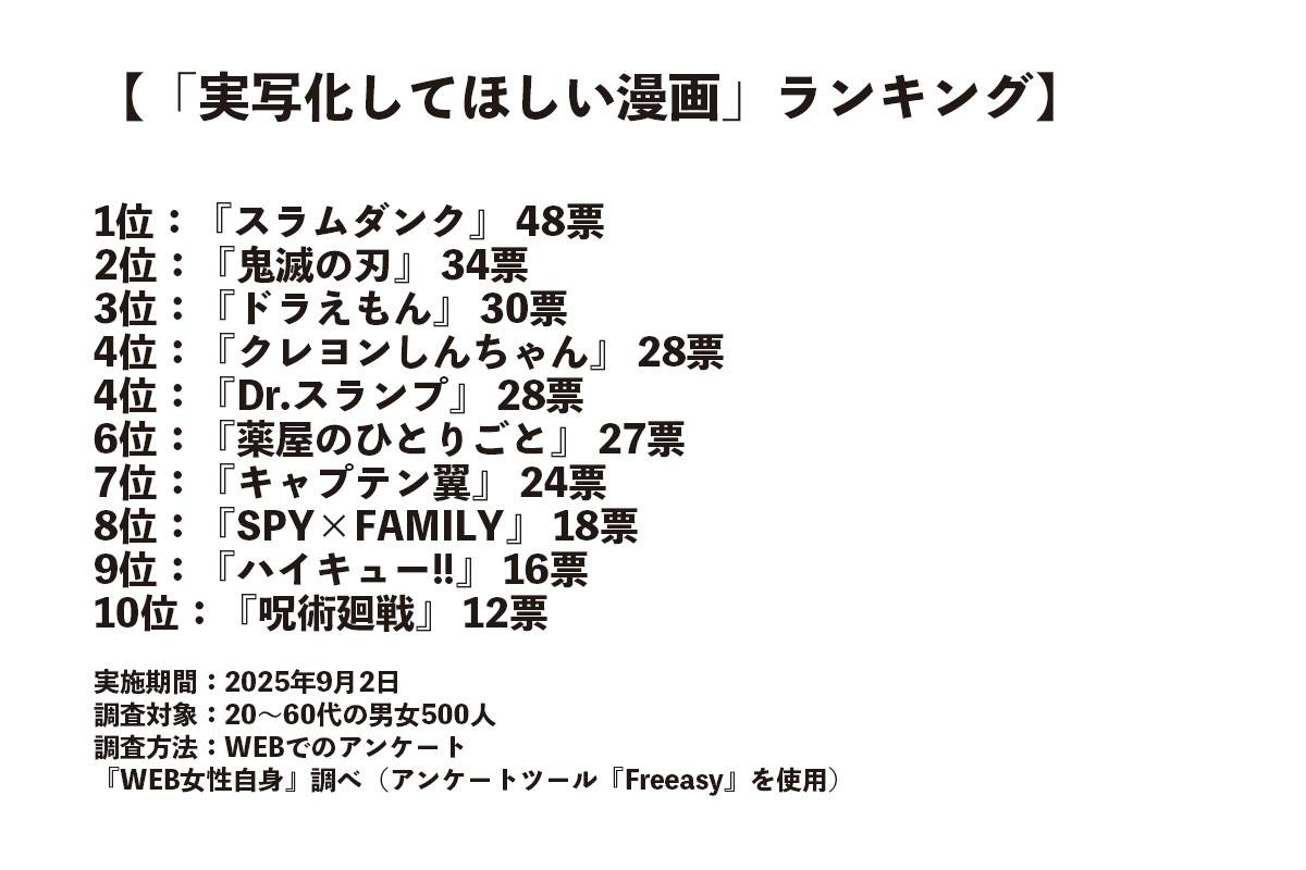 『19番目のカルテ』のように近年漫画原作の映画やドラマは増えており、これまで多くの作品が実写化されてきたが、有名作品であっても未だに実写化されていないものもある。そこで本誌はWEBアンケートツール「Freeasy」にて、20~60代の男女500人を対象に「実写化してほしい漫画」についてアンケート調査を実施した。