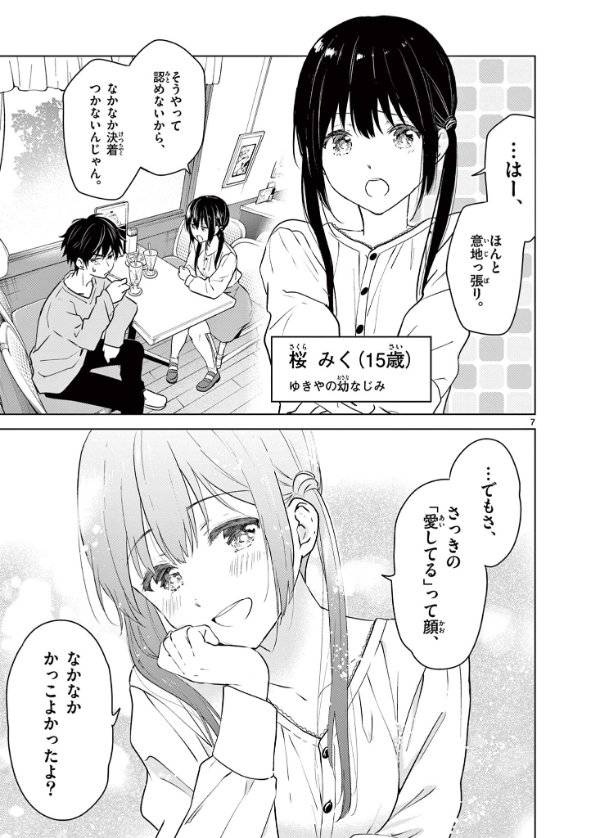 「愛してるゲームを終わらせたい」は、両片思いながら素直になれない幼なじみの優希也とみくを描くラブコメディ。キービジュアルには、交互に「愛してる」と言って照れたほうが負けとなる「愛してるゲーム」を始めた小学6年生の優希也とみくが、高校生になるまでの年月の流れが描かれた。
