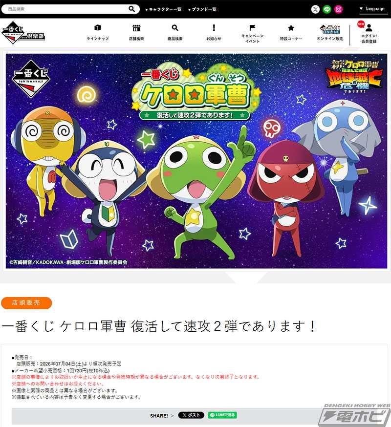 BANDAI SPIRITS ロト・イノベーション事業部の公式サイト「一番くじ倶楽部」にて、「一番くじ ケロロ軍曹 復活して速攻2弾であります!」ページが公開。2026年7月4日(土)より順次発売予定と発表されました。フィギュア画像もお披露目!