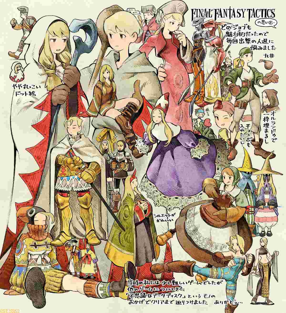 そしてファミ通.comでも本作の発売記念として、マンガ『ダンジョン飯』の作者であり、ゲームファンとして知られる九井諒子先生が描き下ろしたスペシャルイラストを公開! 『FFT』の大きな魅力である多彩なジョブを九井先生ならではのタッチで描いた1枚となっているので、ぜひ九井先生のファンも『FFT』のファンも、じっくりと堪能してほしい。