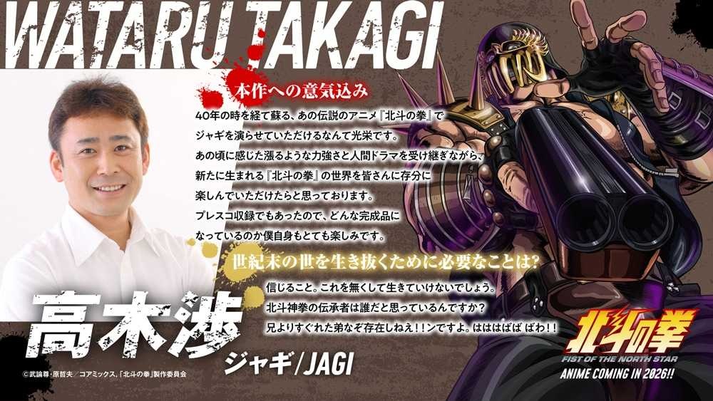 発表されたのはケンシロウを除く3名。ジャギ役は高木渉さん、トキ役は最上嗣生さん、ラオウ役は楠大典さんが務める。ケンシロウ役は武内駿輔さんについてはすでに発表されており、これで北斗四兄弟のキャストがすべて出揃ったことになる。あわせて、新キャストによる名セリフを聞けるPVも公開された。