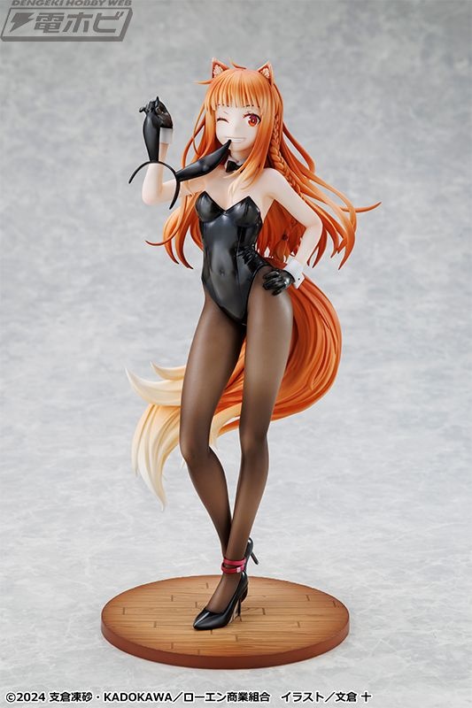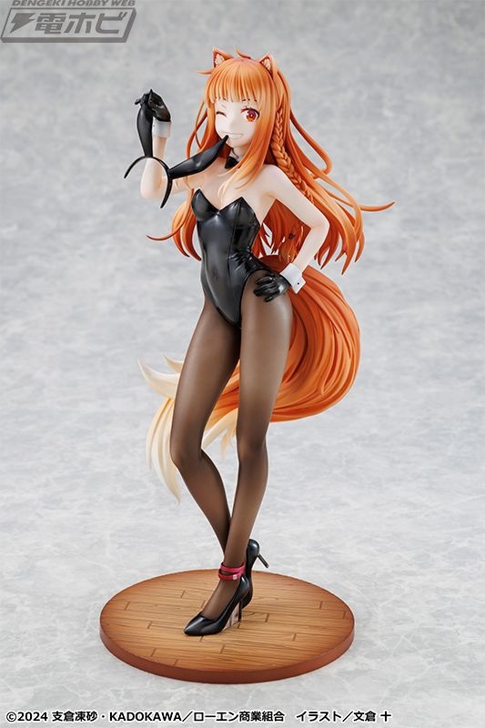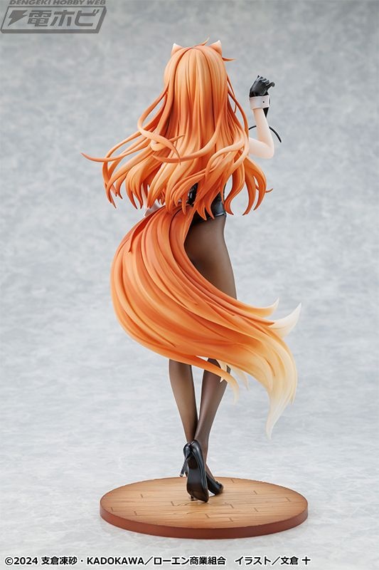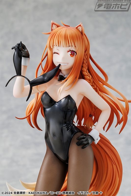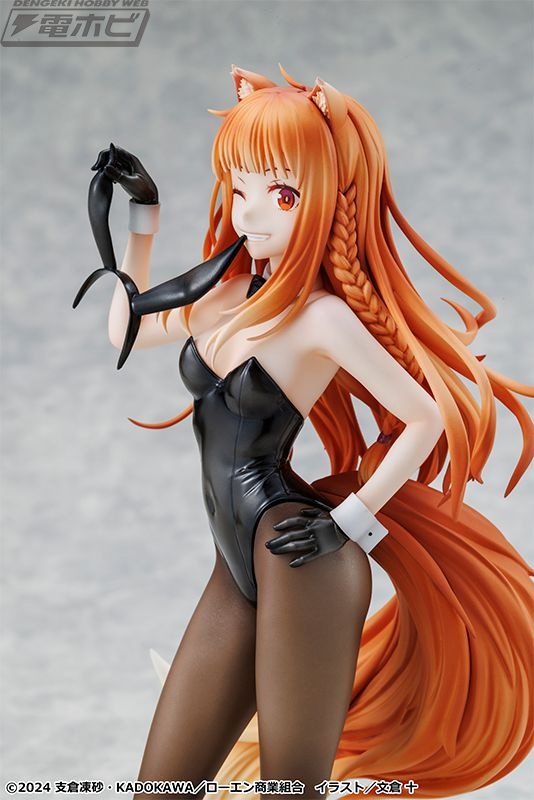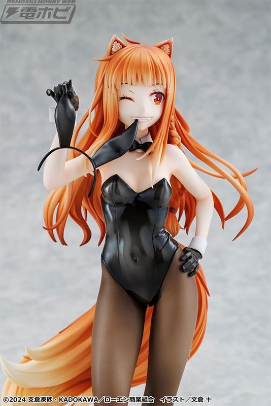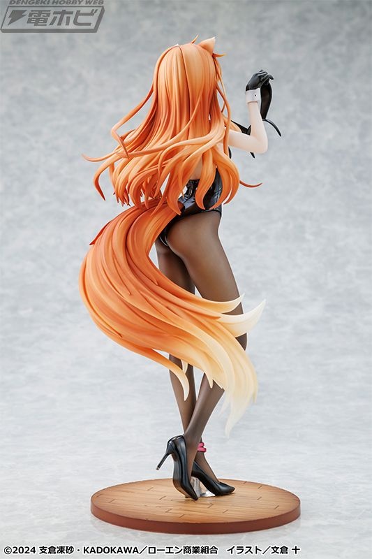 原作イラストレーター・文倉十氏がグッズ用に描き下ろしたイラストをモチーフに立体化された本アイテム。シックな黒バニースーツに身を包み、しなやかなホロのボディラインが丁寧に再現されています。また、艶感のあるバニースーツや素肌の透け感が表現されたタイツも繊細な塗装で仕上げられています。