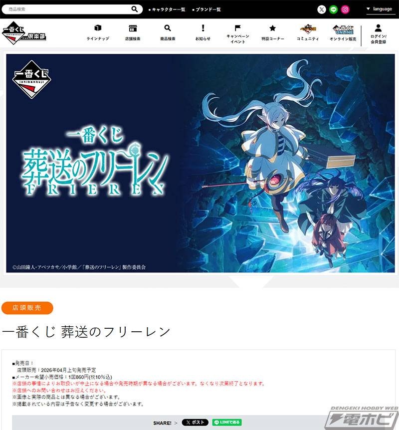 A賞に「フリーレン フィギュア」がラインナップする一番くじ。浮遊感のある造形と美しいエフェクトに注目です。続報をお楽しみに!