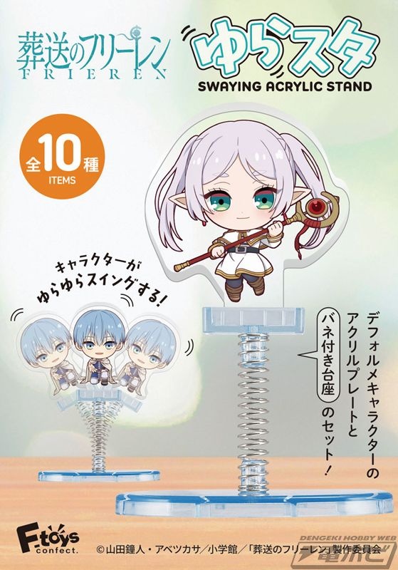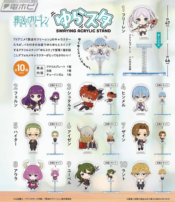 アニメ『葬送のフリーレン』のキャラクターたちが、バネ付きの台座でゆらゆらとスイングするアクリルスタンド「ゆらスタ」となって登場! 描き起こしデフォルメキャラクターがとってもかわいい! 単品はブラインド仕様で、10個入り1BOXを購入すれば一挙に全10種類が揃います。