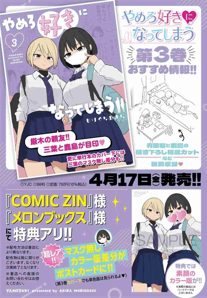 今回発売になったコミックス「やめろ好きになってしまう」2巻【AA】には第14話~第28話、第15.5話、第21.5話、第24.5話、第27.5話、第27.8話と「おまけ」2編を収録(もくじ)し、折込チラシは『新学期も“あざとさ”が止まらない?』、裏表紙が『故意か無邪気か!?脳内騒然ラブコメディ!』で、オビ謳い文句は『累計300万PV超!』、『反響続々!こんなラブコメが読みたかった!』などになってた。