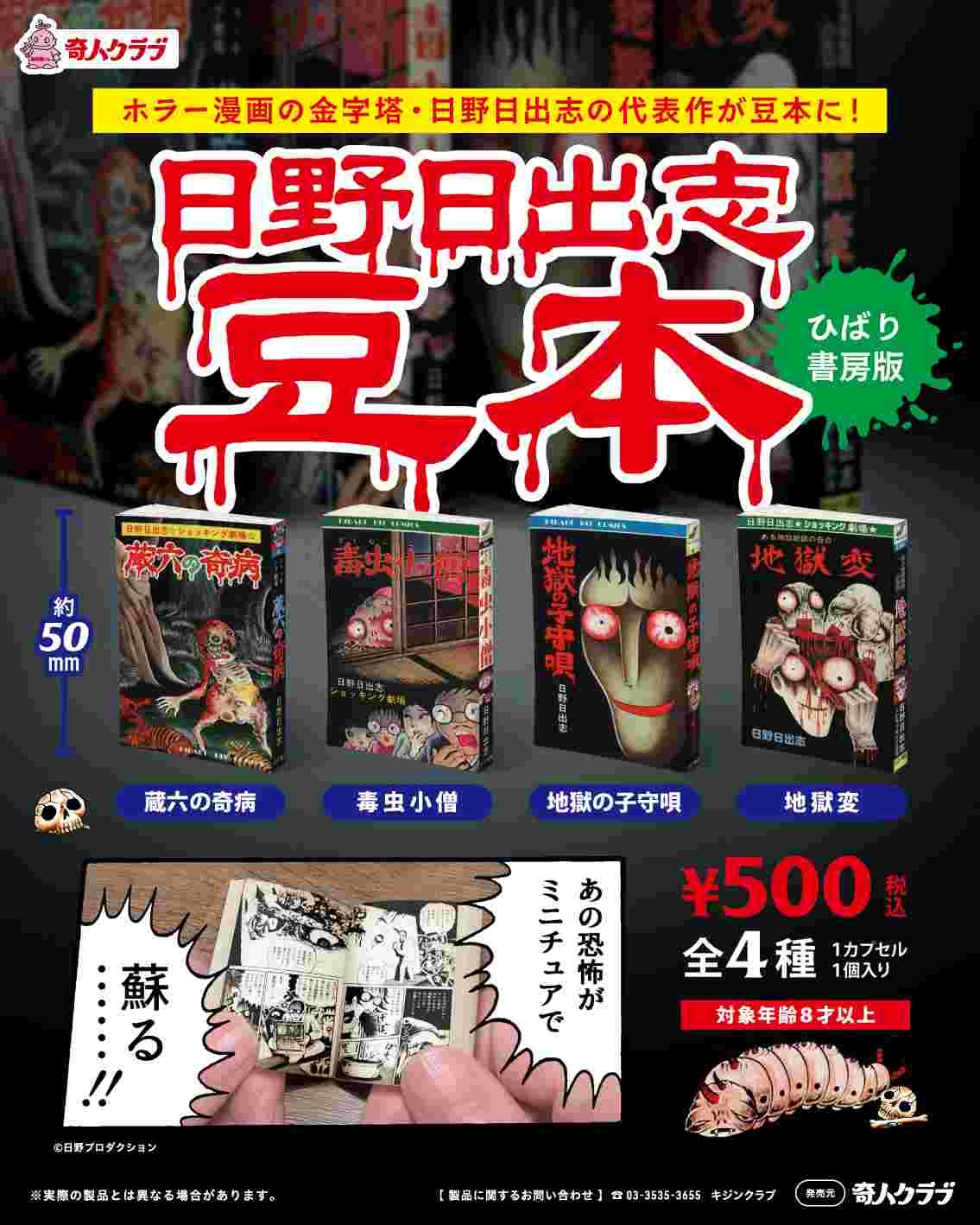発売元は「赤の他人の証明写真」など、奇抜なアイデア商品で注目を集めるカプセルトイメーカーの「奇人クラブ」。代表の寺井広樹さんは筋金入りの日野日出志マニアで、「個人的にはこれまでのカプセルトイ人生で最も作りたかった商品で、感慨深い。豆本のサイズでも日野先生の作品はやはり身の毛がよだちます」と話している。