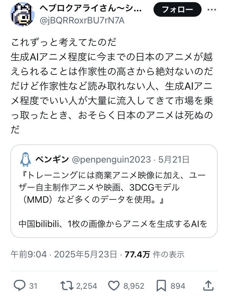 【正論】日本人「生成AIアニメ程度に日本のアニメが越えられることは作家性の高さから絶対ない。しかし・・・」 9000いいね