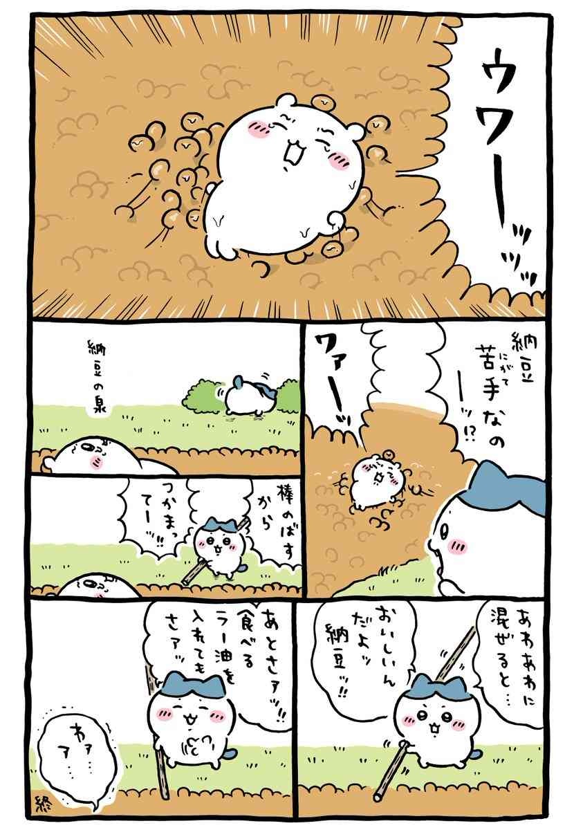 【画像】ちいかわ最新話のハチワレ、ちいかわが納豆の泉で溺れているのに救助そっちのけで食べ方の話に興じるサイコパスぶりを発揮