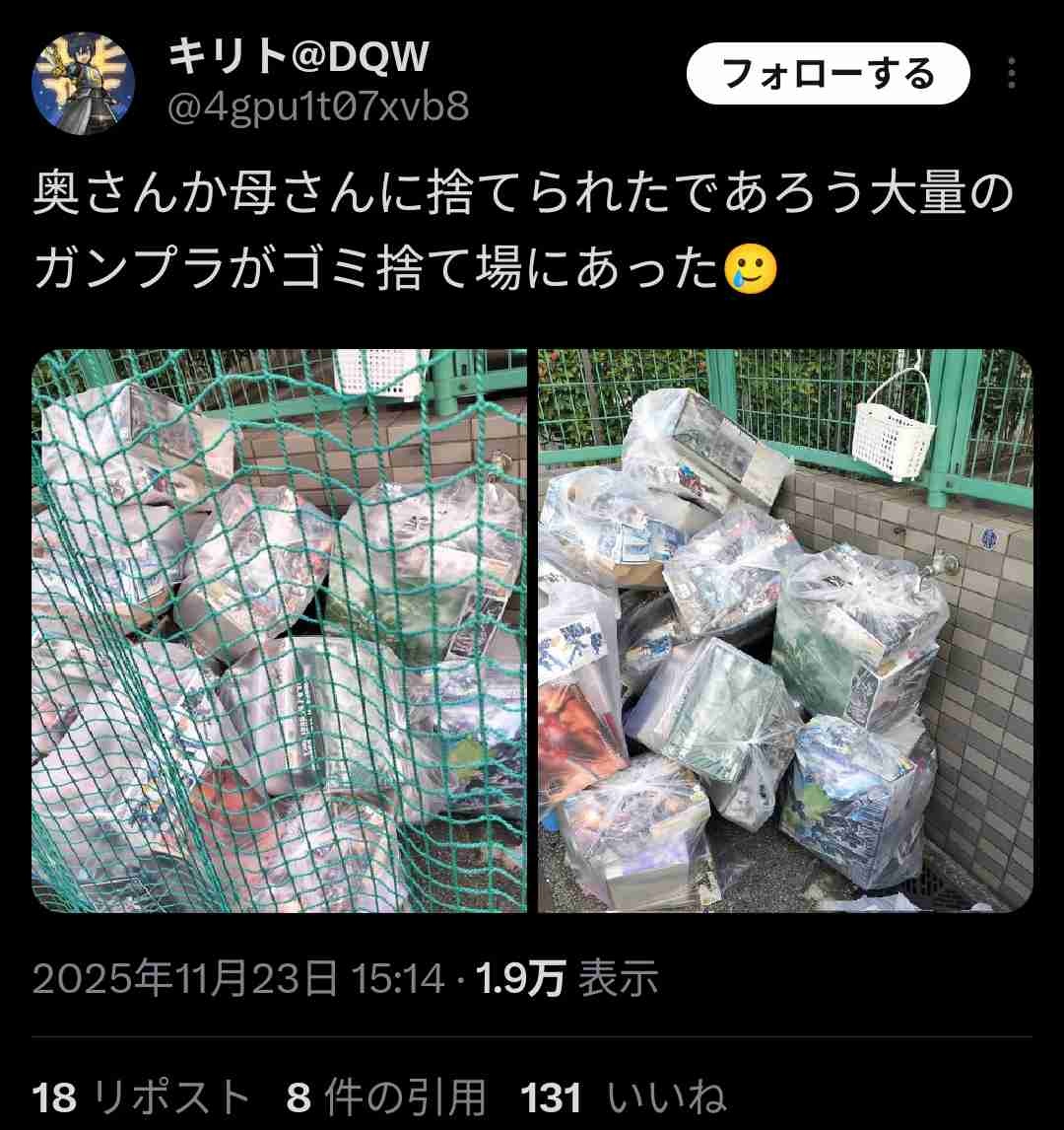 【画像】妻さん、夫に無断でガンプラを大量に捨ててしまうwww