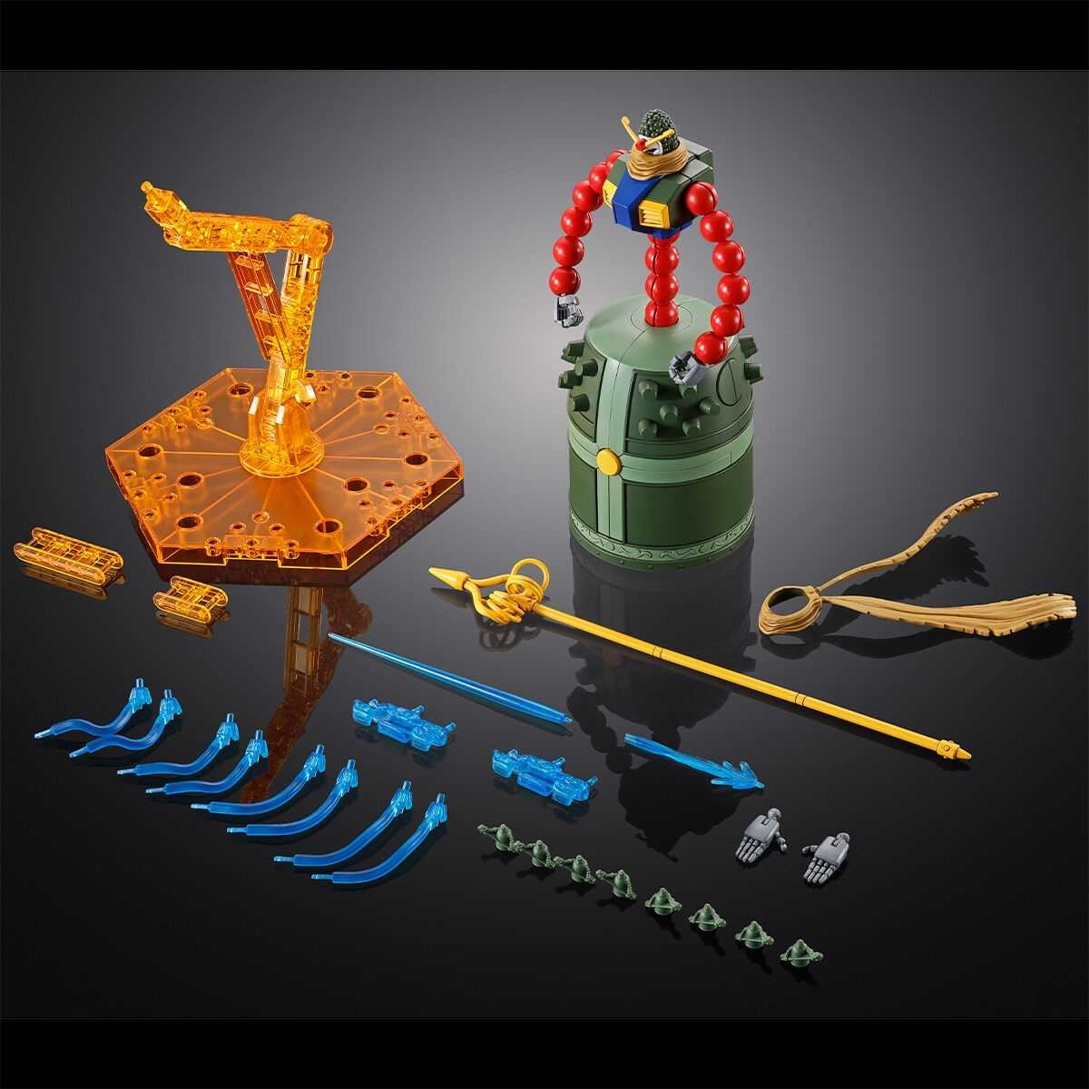 さらに、今川泰宏総監督考案のHGオリジナルギミックを採用。首に巻かれた布がなびいているパーツや、ミニマンダラガンダムと複数のエフェクトパーツを組み合わせることで迫力あるポージングが決まります。また、ミニマンダラガンダムは差し替えで釣り鐘の突起部に装着可能です。