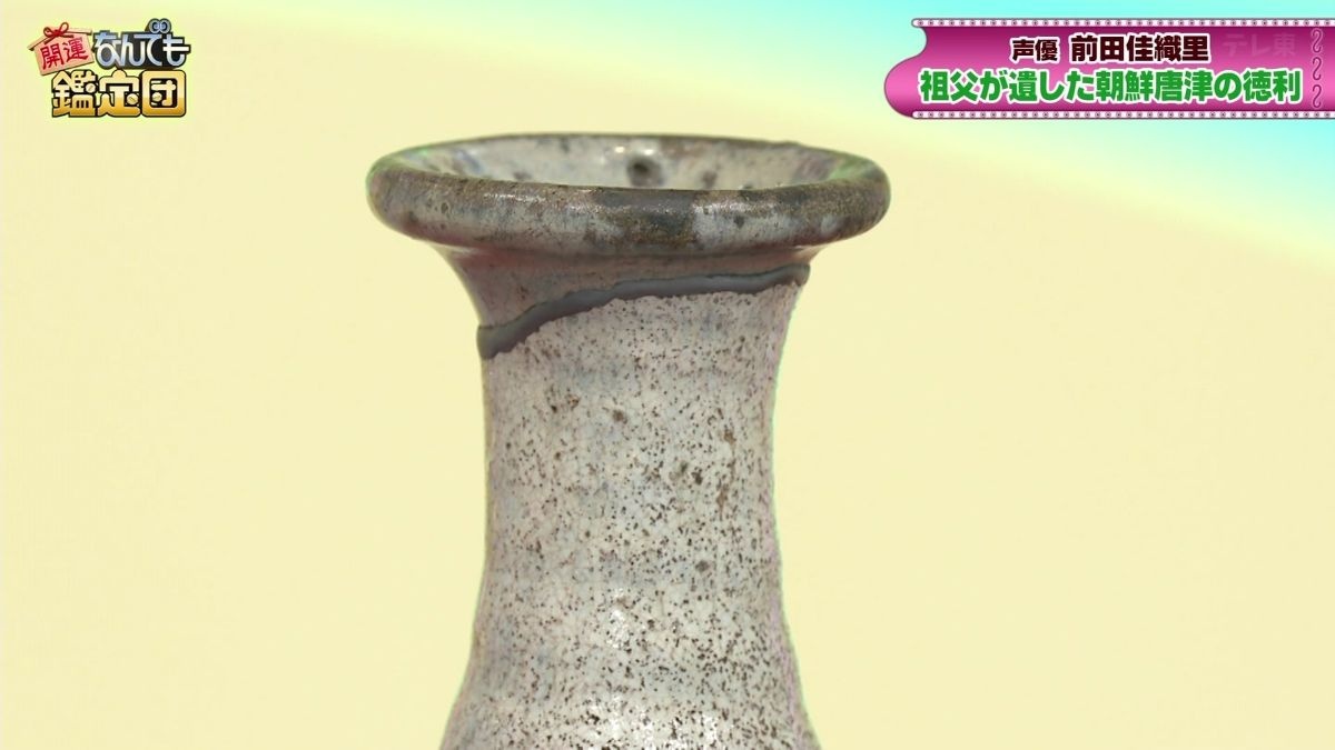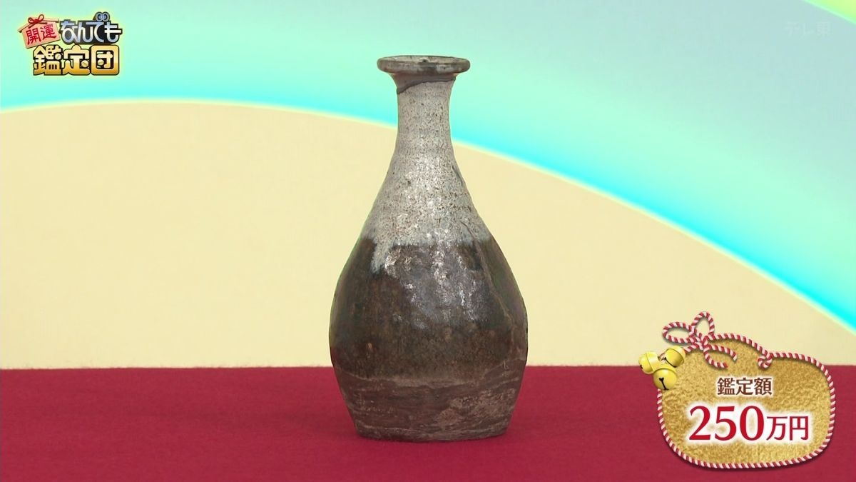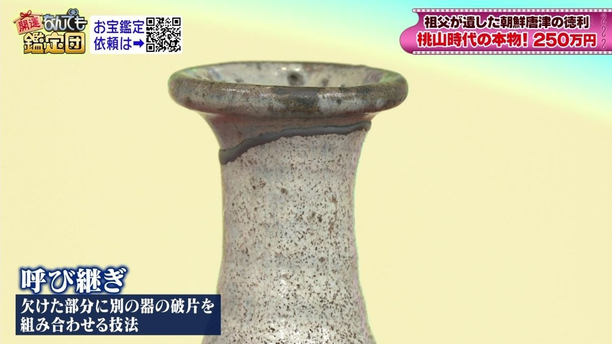 桃山時代に作られた朝鮮唐津の徳利、100本あれば100本偽物という世界であるなかで依頼品は本物に間違いない。胴と首は別々のもの。窯跡から発掘後にうまく合わせて繋いだ「呼び継ぎ」の技法が用いられている。朝鮮唐津のような趣味性の強い焼き物では、呼び継ぎは無傷に準じて扱われる。肩から上は藁灰釉(わらばいゆう)、胴は飴釉がかけられた掛け分けが、朝鮮唐津の特徴である。胴に入った大きな窯傷は、自然体で侘びを感じる良い景色となっている。