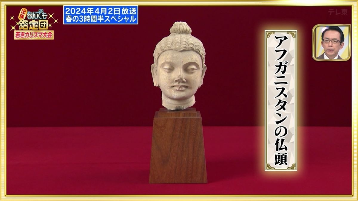 本物に間違いない。アフガニスタンの南東にハッダという仏教遺跡がある。その地域だけの特徴的な仏頭。年代は3世紀ぐらい。素材は漆喰の塑像。大理石の粉を混ぜたりして作るが、素材が柔らかい分、表情も穏やかになって石造のガンダーラ仏よりも柔和。後ろが壊れているように見えるのは、浮彫の像なので壁にくっついているものを剥がすとこのような形になる。博物館級の貴重なもの。
