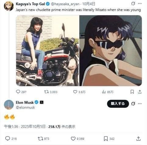 イーロン・マスク「高市早苗はエヴァンゲリオンのミサトだ!素晴らしい!!」