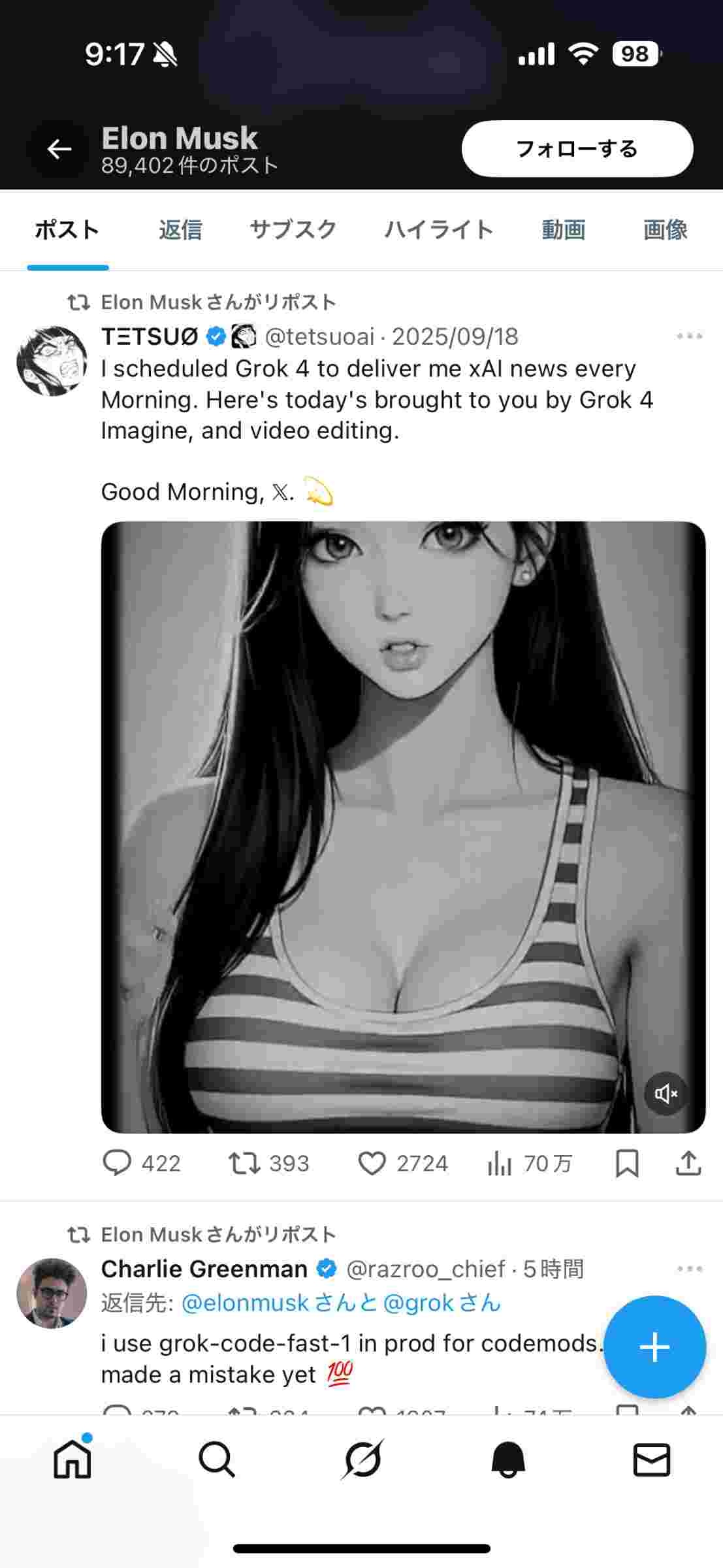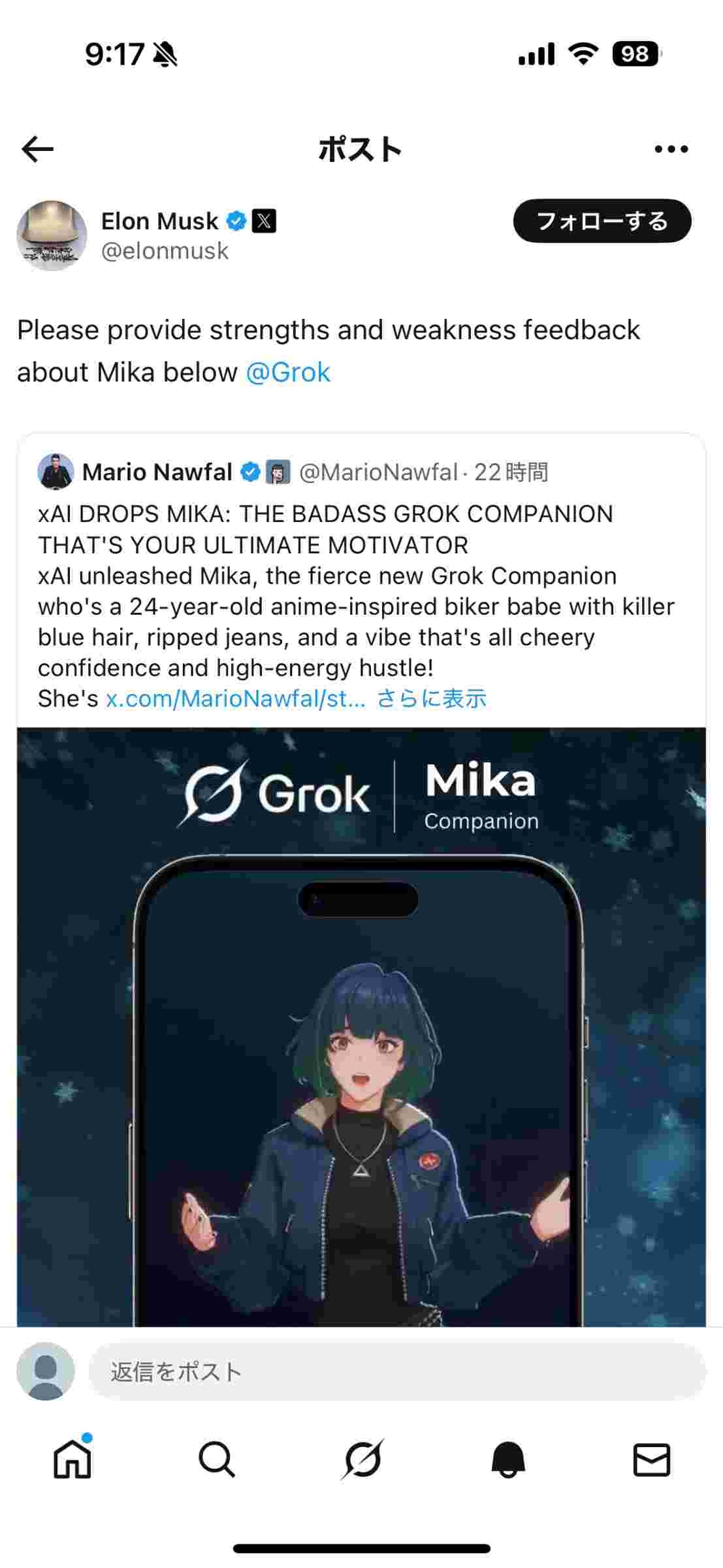 イーロン・マスク(54)、日本アニメ調の女の子のAI動画をリポストしまくる厳しいおじさんになる