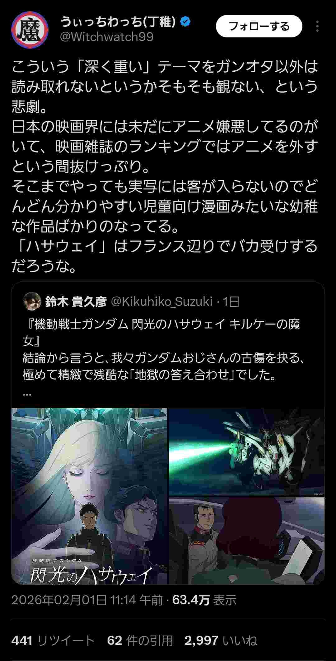うぃっちわっち(丁稚) (@Witchwatch99) on Xこういう「深く重い」テーマをガンオタ以外は読み取れないというかそもそも観ない、という悲劇。 日本の映画界には未だにアニメ...x.com