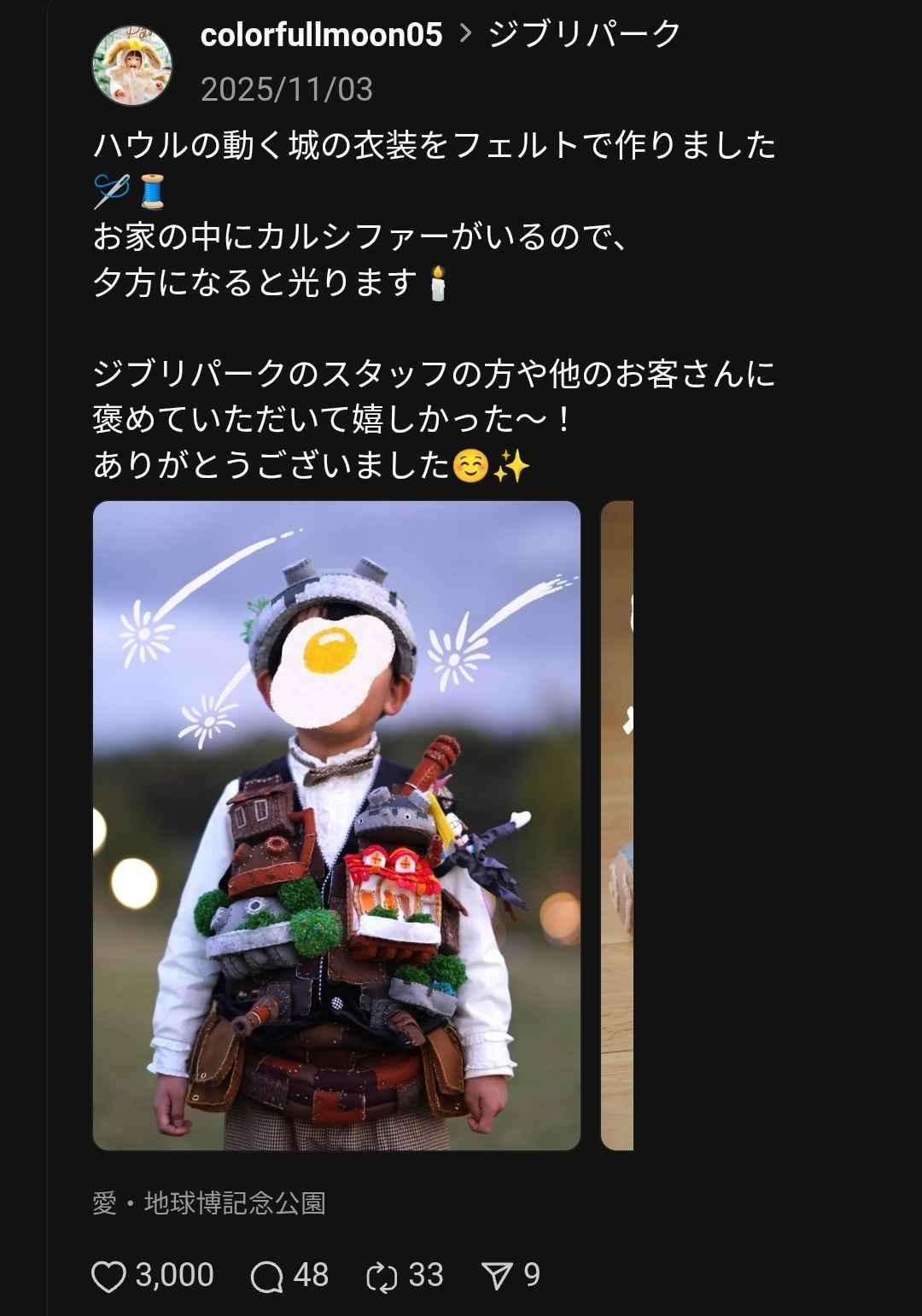 投稿者は、6歳と2歳の兄弟を育てながら、子ども服を作るママ「iamai」(@colorfullmoon05)さん。今回注目を集めているのは、ジブリパーク(愛知県長久手市)へ行ったときの出来事。ママさんは長男くんに“ある衣装”を手作りしました。