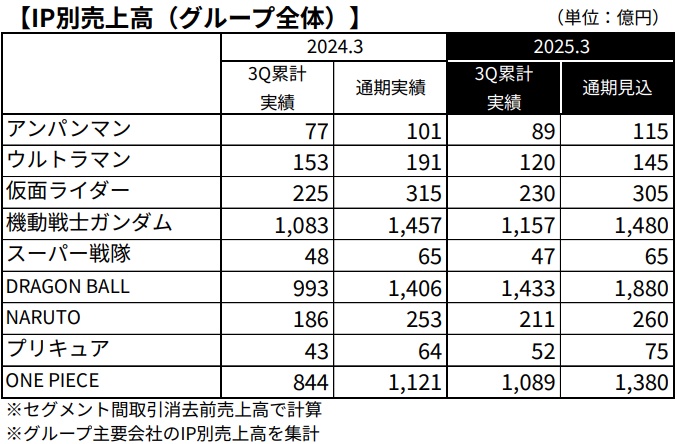 このほか、「機動戦士ガンダム」も同6.8%増の1157億円と伸びた。ガンダムシリーズ劇場公開作品の中で歴代No.1となった「機動戦士ガンダムSEED FREEDOM」やシリーズアニメのグローバル配信、プラモデルなどが好調だったという。