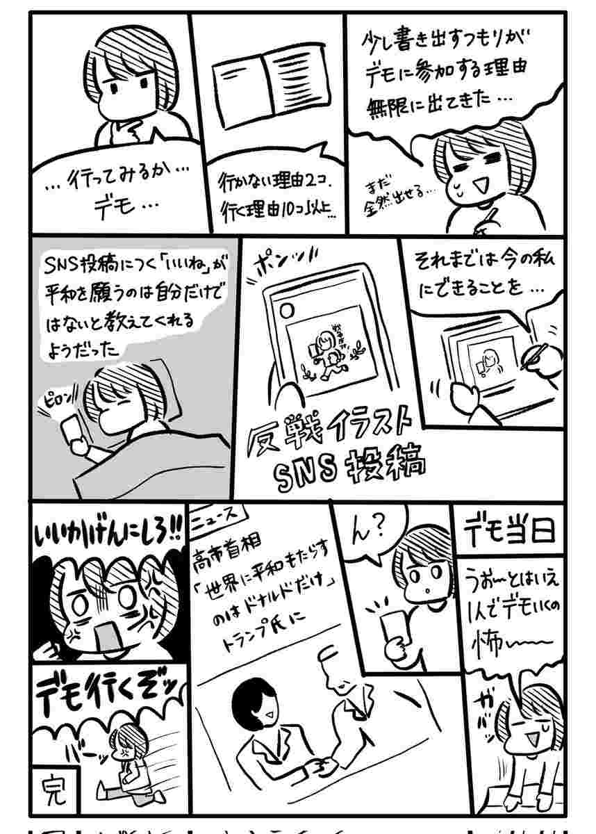 すごくいい漫画でした。デモに⾏き、決断に⾄った思考プロセスを漫画にしてくださってありがとうございました。平和を願う⽇本⼈のひとりとして勇気づけられました読み終わってクソリプの多さにギョッとしました、どうか温かい部屋で美味しいものを⾷べて楽しい時間を過ごしてくださいね