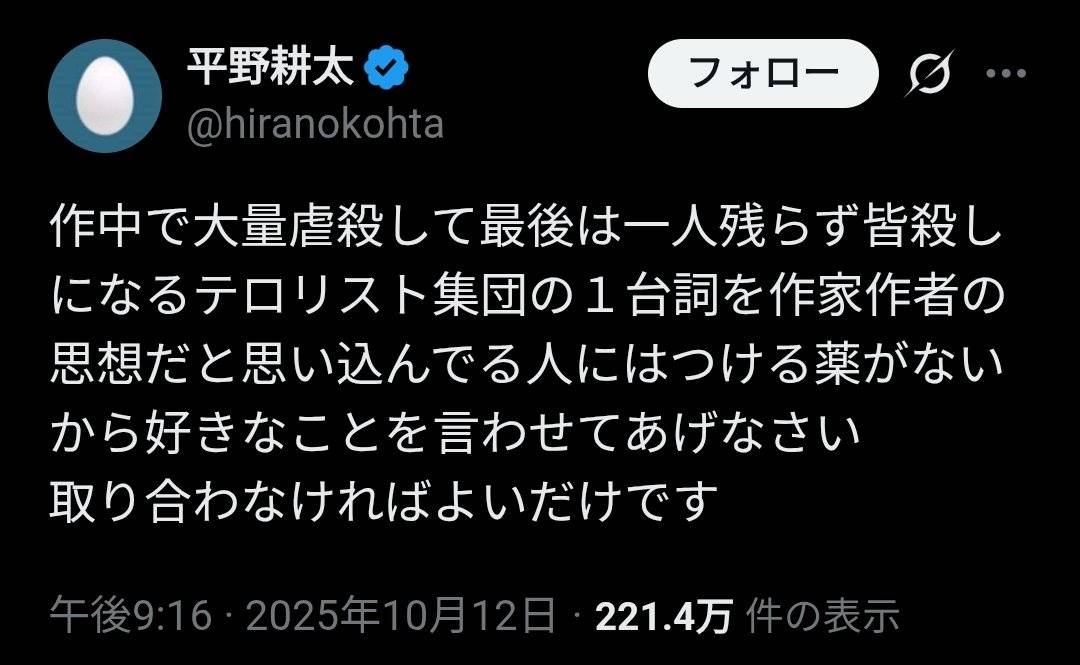 昔は「人を殺したがるやつは作中で全員死んだだろ!」みたいなこと言ってたけどもうそれすら諦めてしまったのか