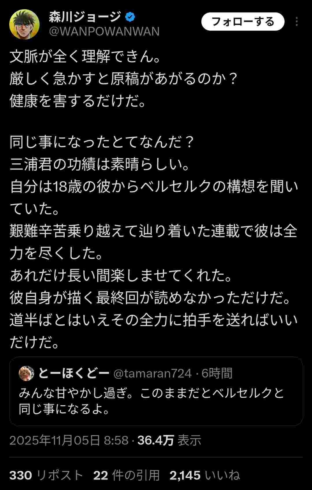ベルセルクはどうやって完結するのか楽しみだったからショックだったけど
