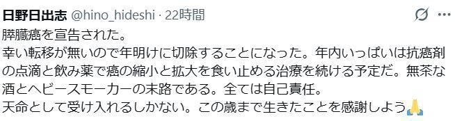 日野氏は「膵臓癌を宣告された」と切り出し、「幸い転移が無いので年明けに切除することになった」と手術を受けることを報告。「年内いっぱいは抗癌剤の点滴と飲み薬で癌の縮小と拡大を食い止める治療を続ける予定だ」と今後の治療について説明した。