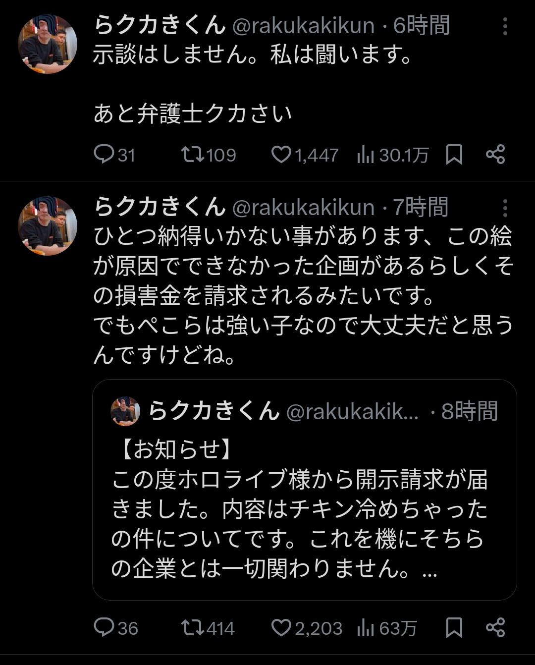 ホロライブさん、「チキン冷めちゃった」のイラスト投稿者への開示に成功