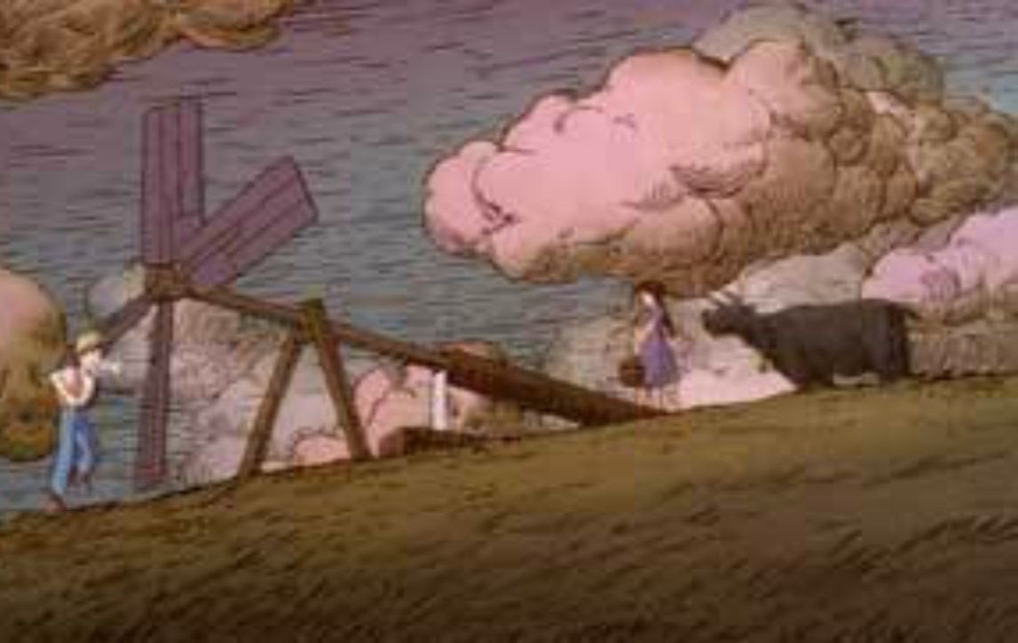 パズーが羽ブンブンの乗り物でOPに映っていた牧場にシータを連れて行って降ろしてから去るってやつか?