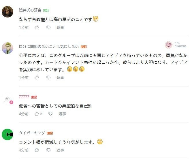 中国人ですら当局の批判するのにジャップときたら「サナ頑張れ!」だもんな