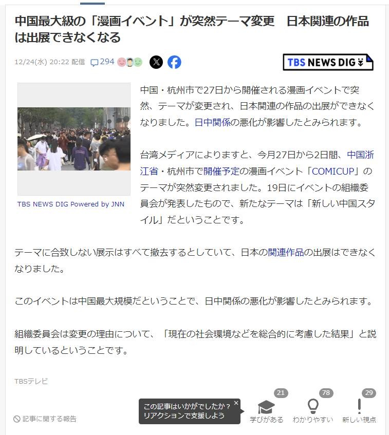 中国最大級の「漫画イベント」突然テーマ変更、キンペーの言論弾圧で日本関連の作品は出展できなくなる