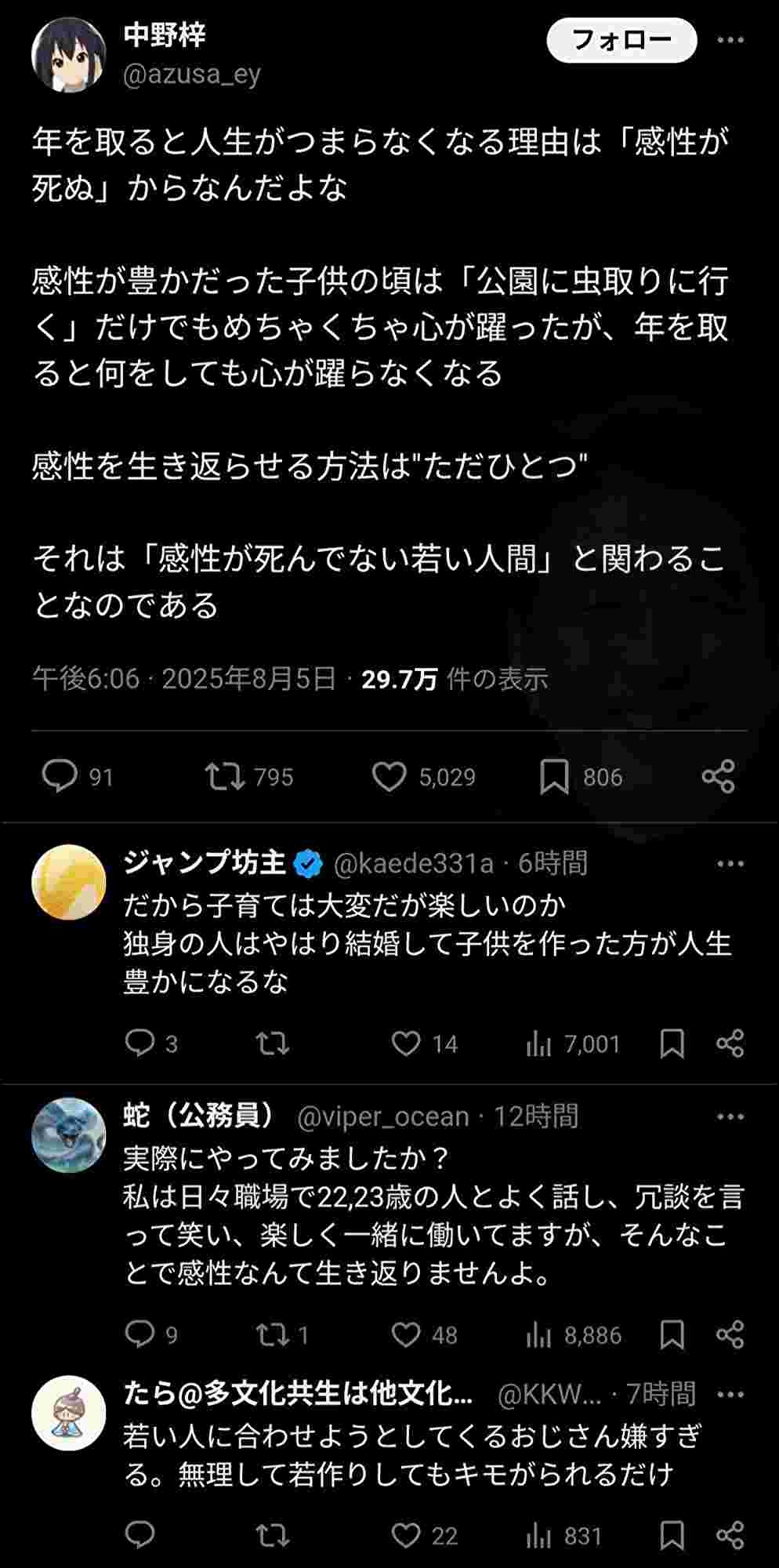 俺はむしろ逆で若い頃は若者がつまらないと思ってたけど年取ると若者が面白いわ