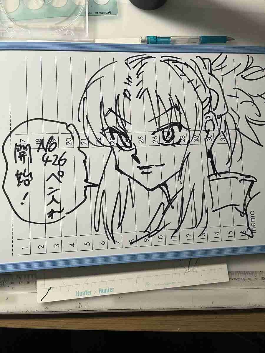 連日のように最新原稿の進捗状況や新イラストを投稿しているが、この日はマチを描いたホワイトボードを投稿。「No426ペン入れ開始!」と進捗状況を伝えた。
