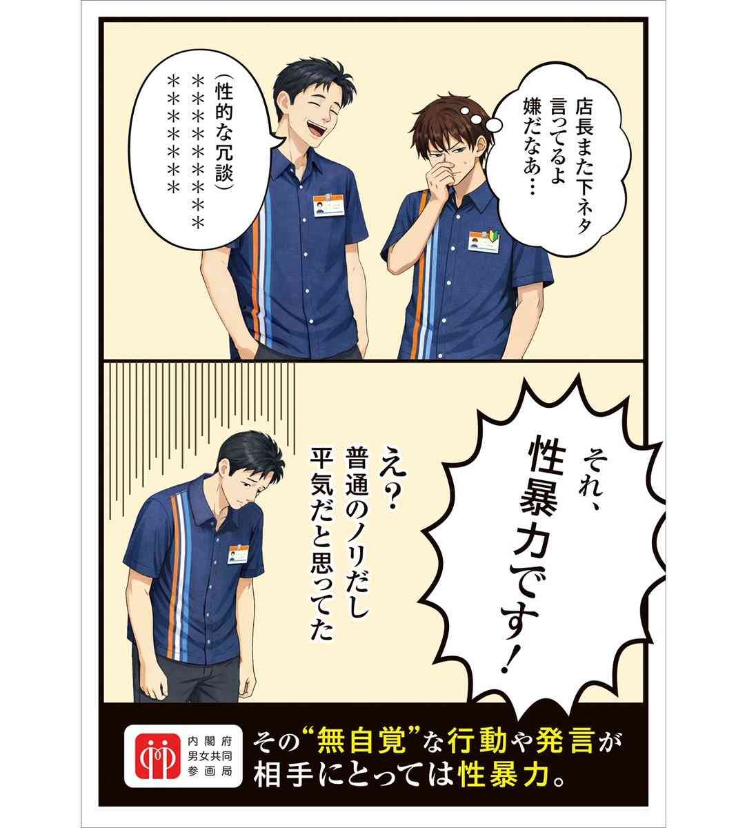 内閣府男女共同参画局が4月20日に投稿した「若年層の性暴力被害予防月間」の啓発漫画が、物議を醸している。性的な発言や画像の送信など、さまざまな性暴力への注意を呼びかける内容だが、公開された複数のイラストで、加害者が女性、被害者が男性として描かれている。