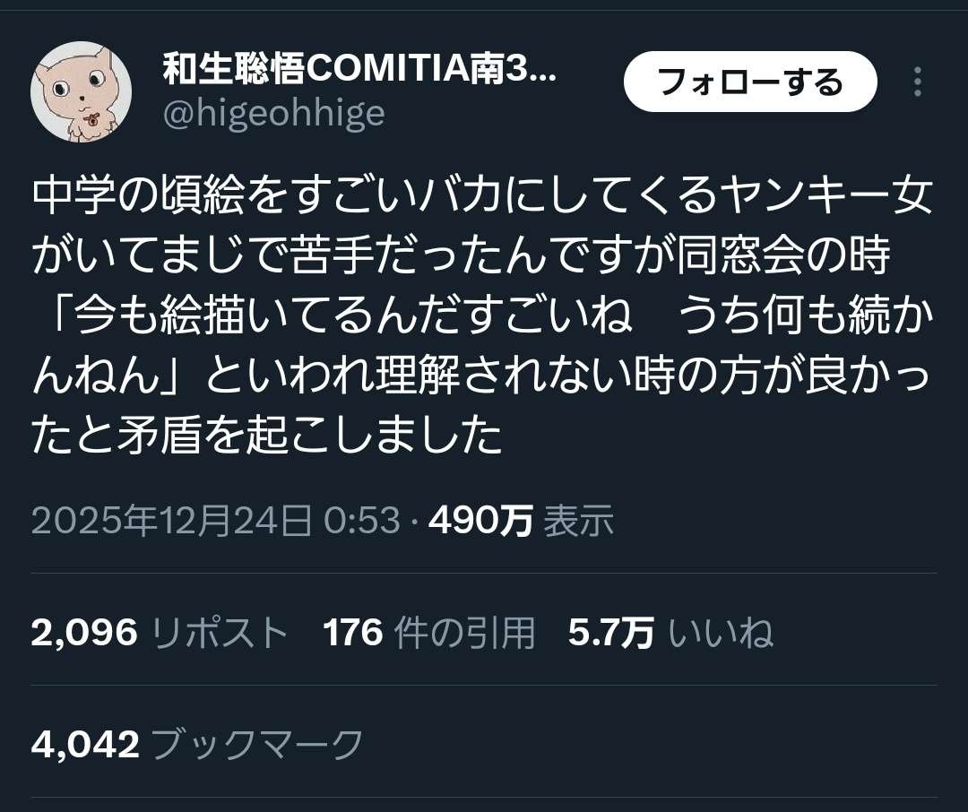 同窓会出たら当時「漫画家になる」って言いふらしてたのクラスの女子にまだ記憶されてたわ、当然なってないが