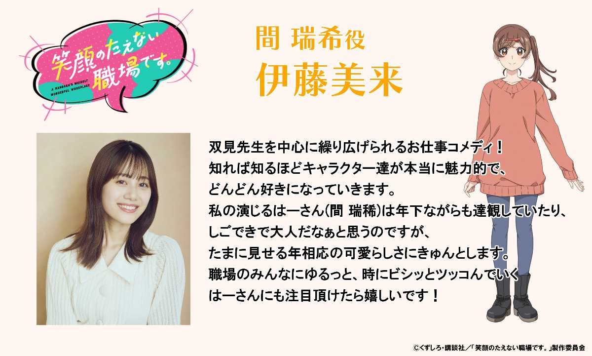 伊藤美来さんは、『がんばっていきまっしょい』佐伯姫や『アイドルマスター ミリオンライブ!』七尾百合子、『五等分の花嫁』中野三玖、『笑顔のたえない職場です。』間瑞希などのキャラクターを演じている声優さんです。