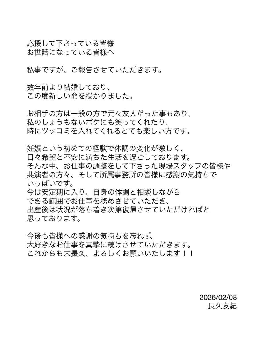 長久は「応援して下さっている皆様、お世話になっている皆様へ、私事ですが、ご報告させていただきます」と切り出すと、「数年前より結婚しており、この度新しい命を授かりました」と報告した。