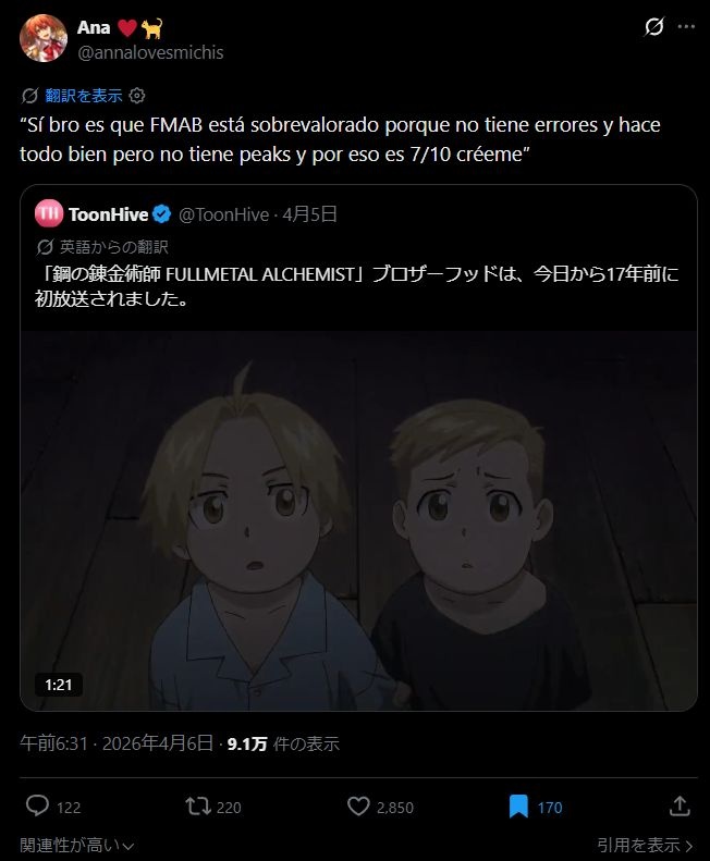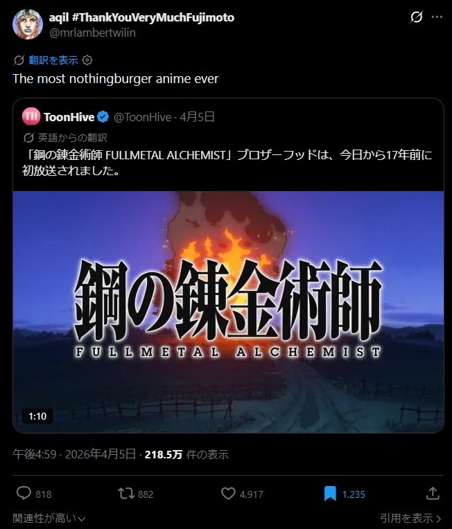 外国人「ハガレンは史上最もなにもないアニメ」「ハガレンは過大評価だ。だって最高潮の瞬間がないから、ずっと7/10なんだ。」