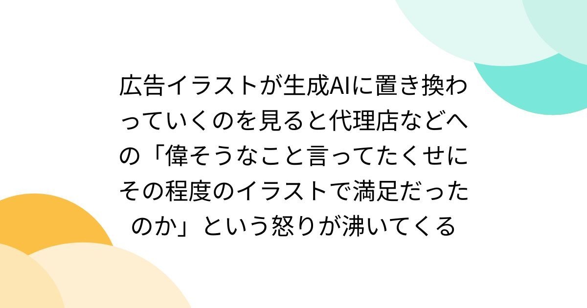 広告イラストがすごい勢いで生成AIに置き換わっていくのを眺めていると静かな怒りが沸いてくるんですけど、それは生成AIの開発者やプロンプト入力者への怒りというより、「なんだお前ら、偉そうなこと言ってたくせにその程度のイラストで満足だったのか」という広告主や代理店への怒りだったりします。