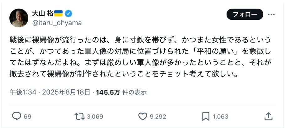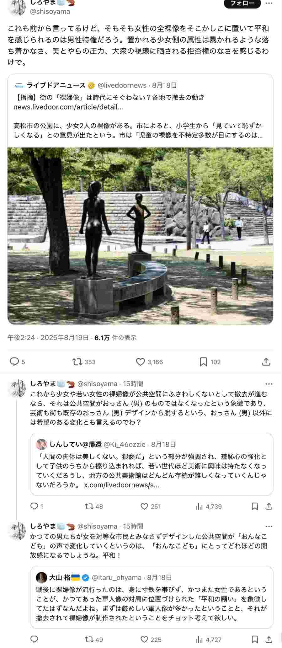 街の裸婦像は時代にそぐわない? 撤去の動き、各地で…小学生「見ていて恥ずかしくなる」 - ライブドアニュース公園や駅前、橋上にある裸婦像が、公共の場にふさわしくないとして、自治体が撤去する動きが相次いでいる。裸婦像は戦後に撤去さ...news.livedoor.com