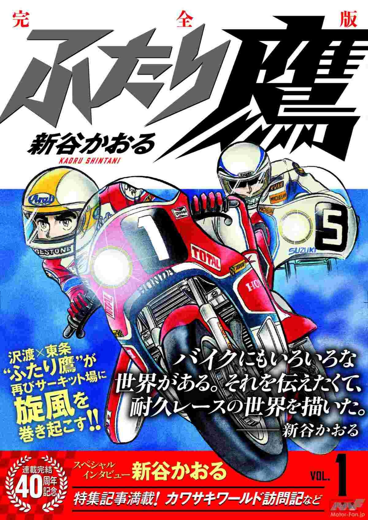 新谷かおるが描くバイクマンガの金字塔『ふたり鷹』が、連載完結40周年を記念して全8巻で復活刊行される。B5判という雑誌サイズで、これまでの単行本や愛蔵版を上回るビッグサイズと各巻400ページ超という大ボリュームで楽しめるのが特徴だ。