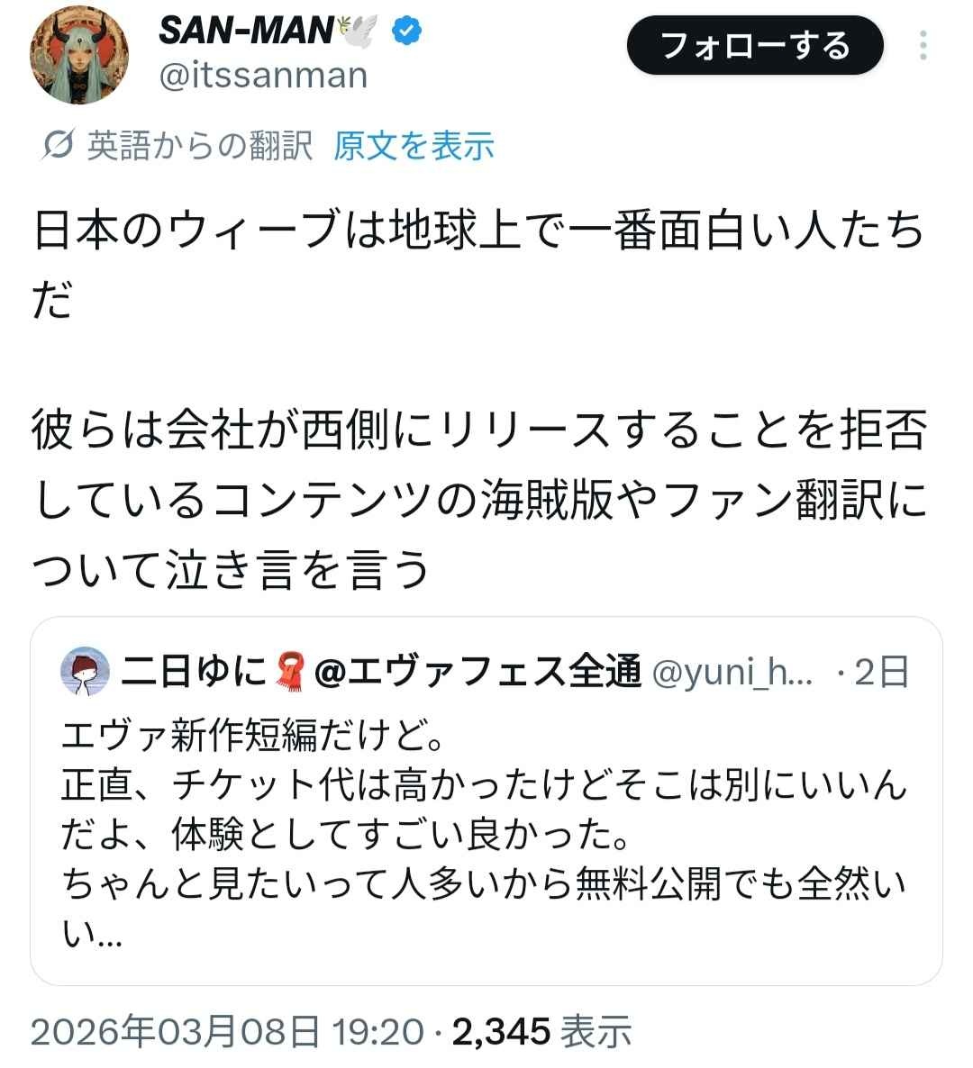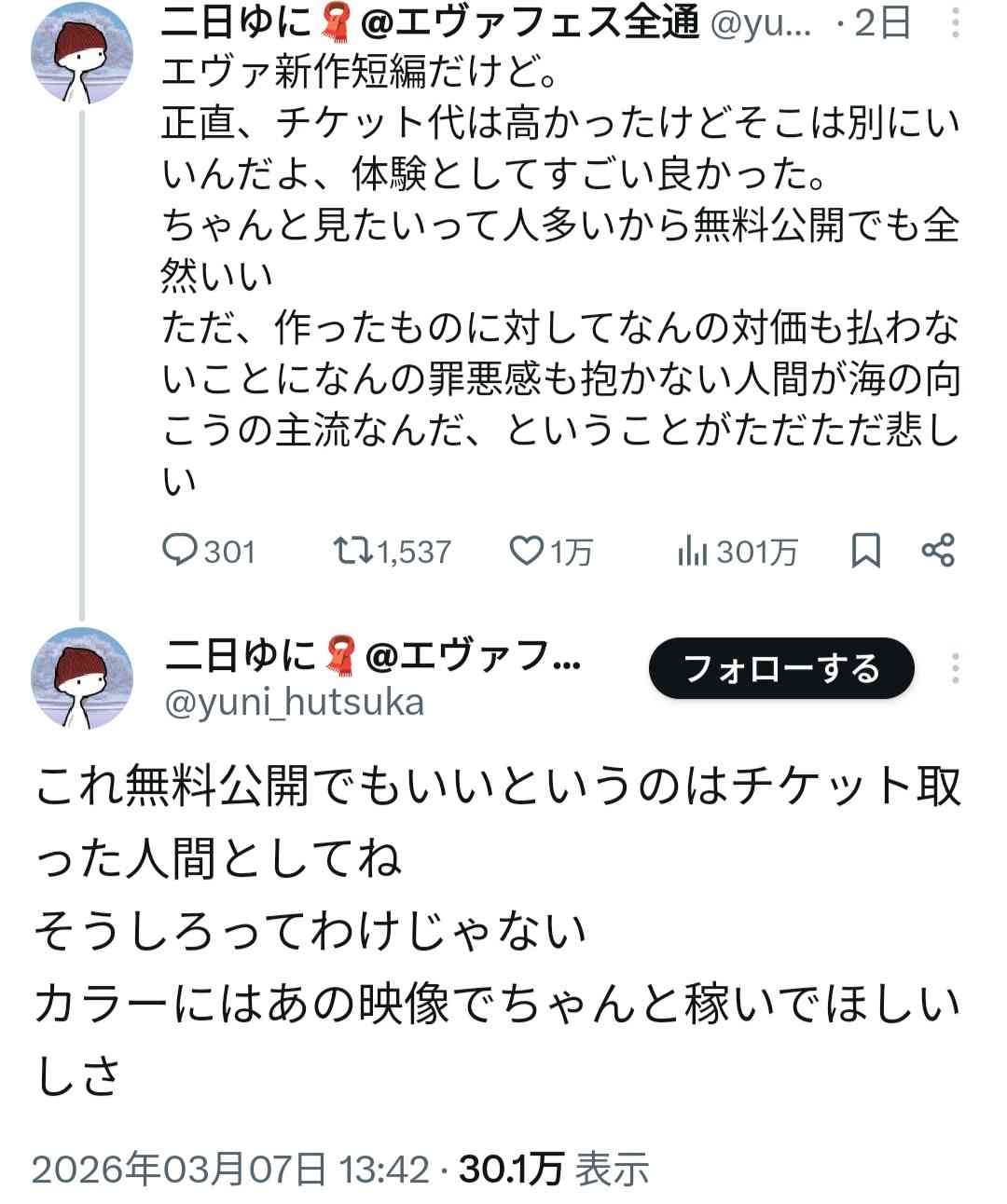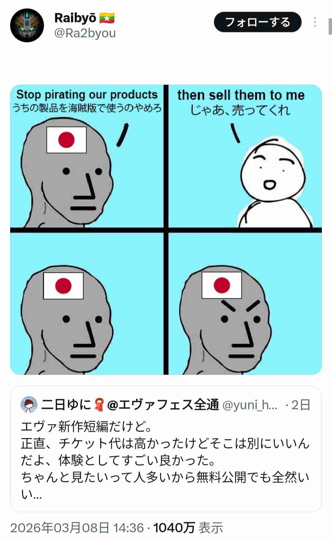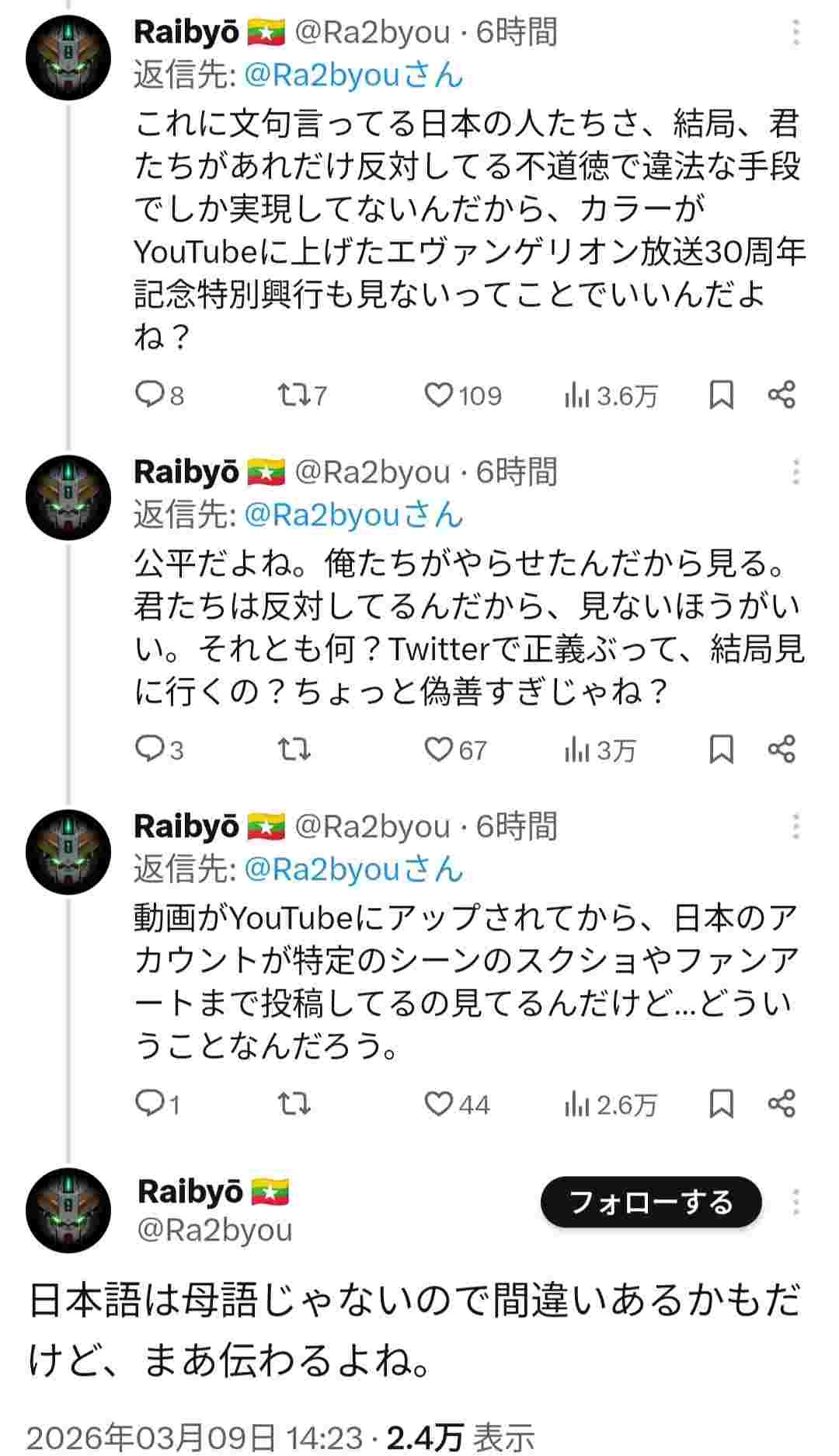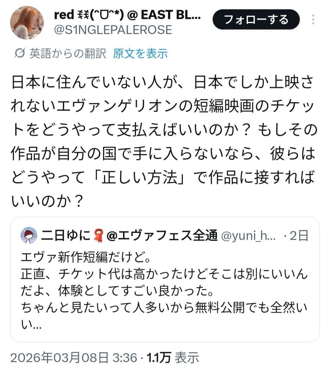 日本人「エヴァ短編アニメが無料公開されたけど、海外の人は金を払わない事に罪悪感がないのが悲しい」→外国人達にめちゃくちゃ叩かれる