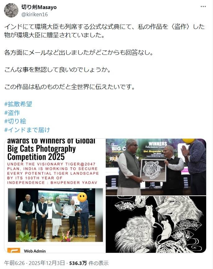 日本人切り絵師、インドの環境大臣に贈呈されたインド人芸術家の切り絵作品が自分の作品だと騒ぎ立てるインド人の作品