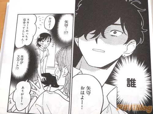 今回発売になった「まどわせないで矢守くん」1巻【AA】には、第1話から第7話と、「特別描きおろし」を収録(もくじ)し、オビ謳い文句は『後ろの席の友人(♂)がスカート履いてきた』、『SNSで話題沸騰!イメチェン男子×女装男子の凸凹コメディ!』で、裏表紙は『かわいすぎるクラスメイトに惑わされっぱなし!?』、『魅惑の男の娘にガチ恋、注意!?』、『イケメン♂×美少女♂の凸凹ラブ(?)コメディ!』などだった。