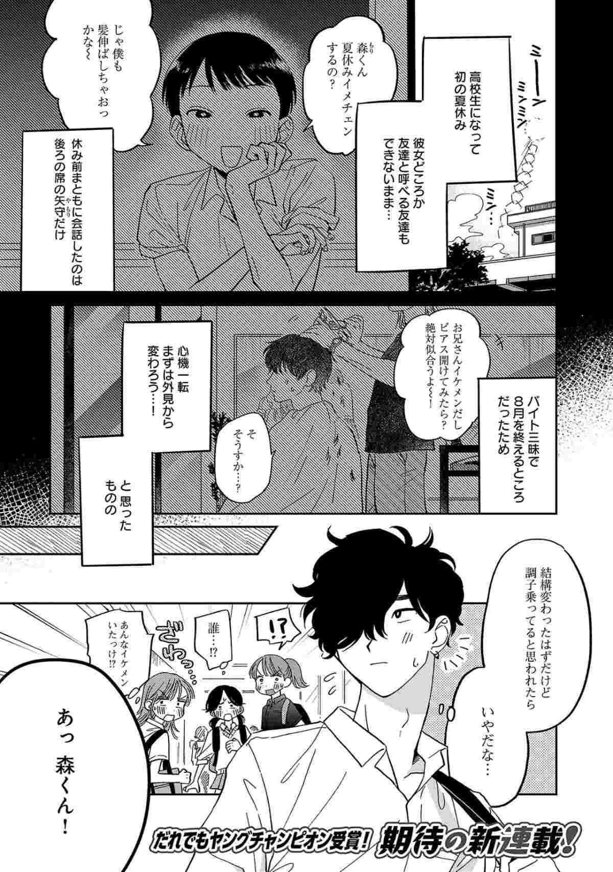 高校生になって初の夏休み。後ろの席の矢守とともに、夏休みにイメチェンすることを決意した森は、髪型を変え、ピアスを開けてみた。一方の矢守はなぜか女装で登校。しかも森に思わせぶりな言動ばかり取ってくるようになって……。イケメンと美少女に扮した少年の青春ストーリーだ。