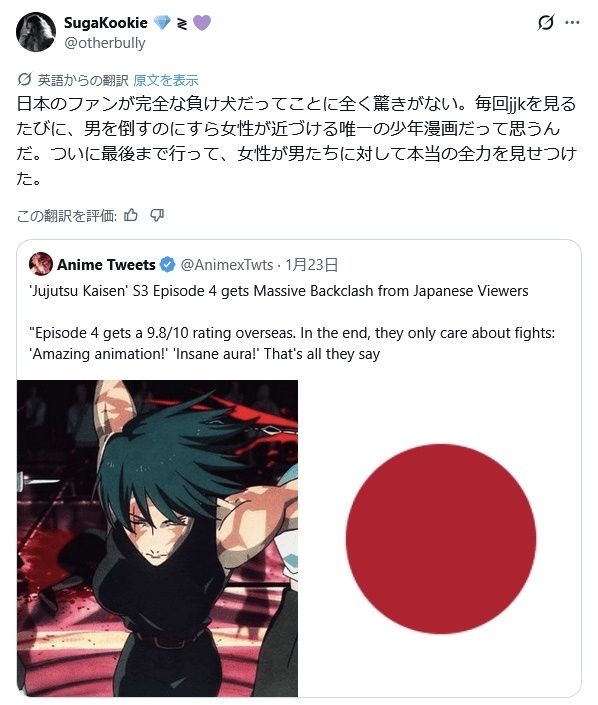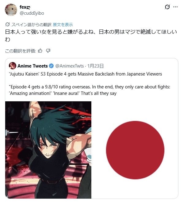 海外フェミ「日本のファンが呪術廻戦のアニメを悪く言うのは女が強いから!日本は西欧から遅れた男尊女卑の土人国家!」